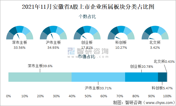 2021年11月安徽省A股上市企业所属板块分类占比图