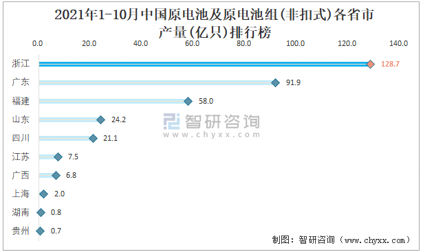 2021年1-10月中国原电池及原电池组(非扣式)各省市产量排行榜