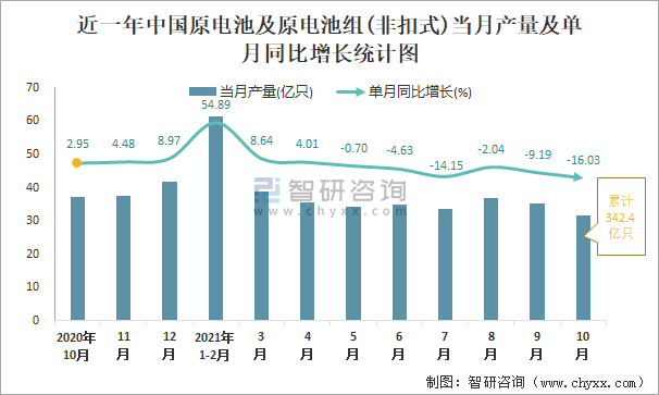 根据国家统计局数据显示:2021年10月中国原电池及原电池组(非扣式)产量为31.5亿只,同比下降16.03%;2021年1-10月中国原电池及原电池组(非扣式)累计产量为342.4亿只,同比增长2.72%;2015-2020年中国原电池及原电池组(非扣式)产量2017年达到最大,此后总体呈现下降趋势。