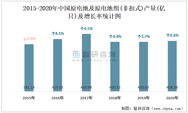 2015-2020年中国原电池及原电池组(非扣式)产量及增长率统计图
