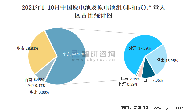 2021年1-10月中国原电池及原电池组(非扣式)产量大区占比统计图