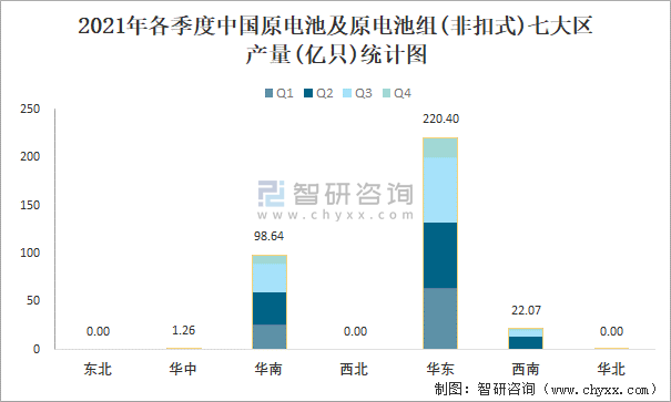 2021年各季度中国原电池及原电池组(非扣式)七大区产量统计图