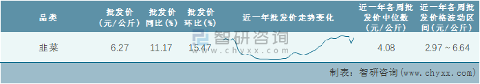 根据农村农业部数据统计可知:2022年第1周全国韭菜平均批发价为6.27元/公斤,同比增加11.17%,环比增加15.47%,近一年全国韭菜平均批发价最高达到6.64元/公斤,批发价最低也要2.97元/公斤。