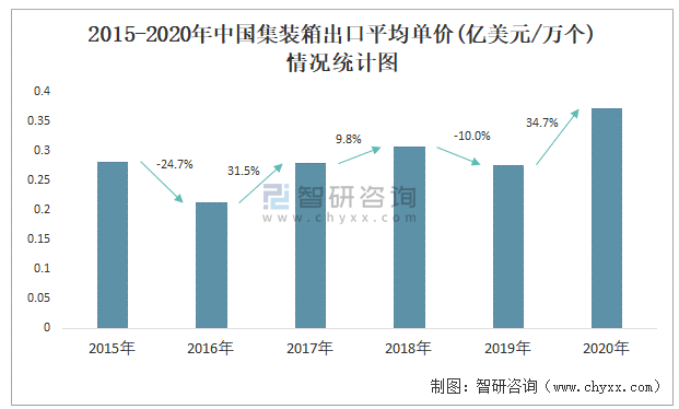2015-2020年中国集装箱出口平均单价(亿美元/万个)情况统计图
